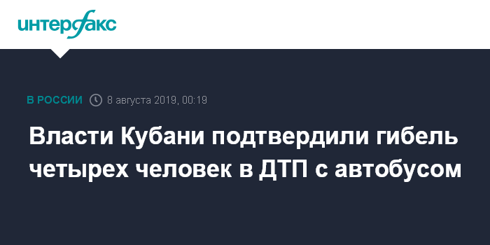 Москва. 8 августа. INTERFAX.RU - Власти Краснодарского края подтвердили гибель четырех человек в аварии с автобусом под Новороссийском.