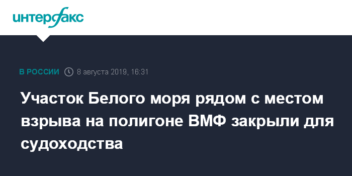 Москва. 8 августа. INTERFAX.RU - Участок Двинской губы Белого моря, рядом с которым на полигоне ВМФ произошел взрыв, закрыли на месяц для свободного плавания. Об этом "Интерфаксу" заявил заместитель капитана морского порта "Архангельск" Сергей Козуб.
