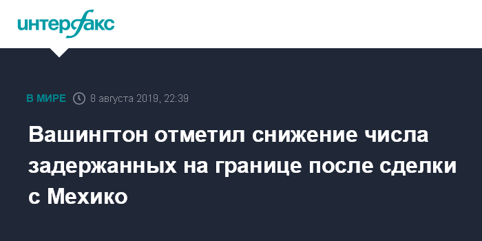 Москва. 8 августа. INTERFAX.RU - В Вашингтоне заявляют, что количество задержаний мигрантов на мексиканской границе в июле снизилось на 21% после заключения с Мексикой соглашения по их сдерживанию, сообщили в четверг западные СМИ.
