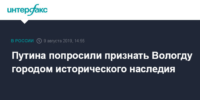 Москва. 9 августа. INTERFAX.RU - Вологодский губернатор Олег Кувшинников попросил президента Владимира Путина наделить Вологду статусом города исторического наследия. Стенограмма беседы чиновников опубликована на сайте Кремля.