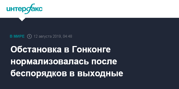 Москва. 12 августа. INTERFAX.RU - После массовых демонстраций в выходные, сопровождавшихся беспорядками и столкновениями с полицией, в понедельник в Гонконге наблюдается спокойствие.