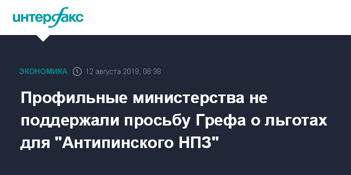 Москва. 12 августа. INTERFAX.RU - Минэнерго и Минфин дали отрицательные отзывы на просьбу предправления Сбербанка Германа Грефа предоставить "Антипинскому НПЗ" налоговые льготы, пишет "Коммерсантъ" со ссылкой на три источника. По их словам, отзыв Минэнерго направлен в правительство.