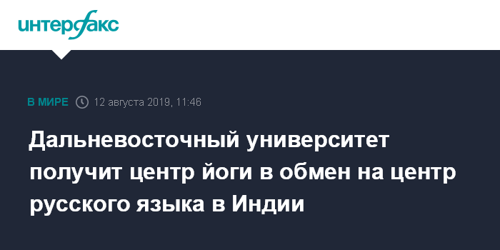 Москва. 12 августа. INTERFAX.RU - Дальневосточный федеральный университет (ДВФУ) и индийский университет Амити договорились о перекрестном открытии центра йоги и Центра изучении русского языка имени Пушкина. Также вузы подписали соглашение о взаимопонимании ради сотрудничества и обмена, сообщила пресс-служба агентства Дальнего Востока по привлечению инвестиций и поддержке экспорта (АНО АПИ).