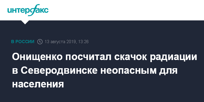 Из сообщения Росгидромета 8 августа стало известно, что в Северодвинске Архангельской области после ЧП с ракетой на военном полигоне радиационный фон на короткое время вырос в 16 раз. Увеличение мощности радиоактивного излучения в Северодвинске было зафиксировано 8 августа около 12:30 до 1,78 мкЗв/ч, к 14:30 радиационный фон нормализовался.