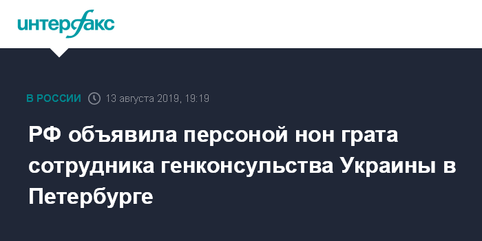 Москва. 13 августа. INTERFAX.RU - Россия объявила персоной нон грата сотрудника генконсульства Украины в Петербурге в ответ на аналогичные действия Киева в отношении российского представителя во Львове, сообщили во вторник в МИД РФ.
