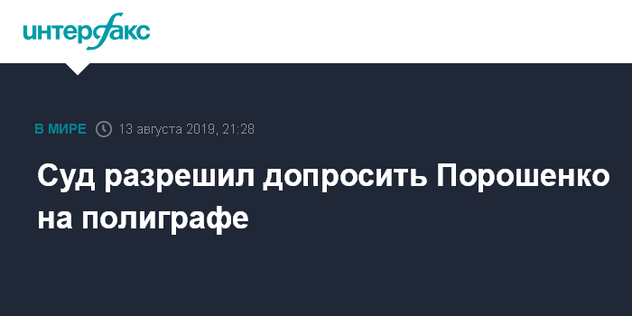 Москва. 13 августа. INTERFAX.RU - Суд в Киеве разрешил допросить пятого президента Украины Петра Порошенко в Государственном бюро расследований (ГБР) с применением полиграфа. Об этом сообщила агентству "Интерфакс-Украина" пресс-секретарь Госбюро Анжелика Иванова.