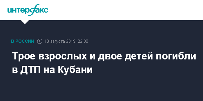Москва. 13 августа. INTERFAX.RU - В Краснодарском крае во вторник вечером в результате ДТП погибли пять человек, включая двоих детей. Об этом сообщили "Интерфаксу" в пресс-службе Главного управления МВД России по краю.