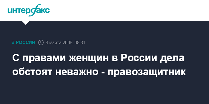 "Во-первых, у безработицы в России - женское лицо. Женщин больше всего увольняют в связи с финансовым кризисом. Во-вторых, в России существует домашнее насилие, которое вообще не считается преступлением. Проблем много. Никакие права женщин у нас не обеспечены, как, впрочем, и права мужчин", - заявила правозащитница.