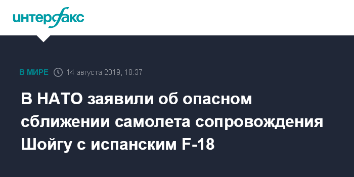 Москва. 14 августа. INTERFAX.RU - В НАТО утверждают, что российский истребитель, сопровождавший самолет министра обороны России Сергея Шойгу над Балтикой, "небезопасным образом" приблизился к истребителю альянса, который поднялся с авиабазы ВВС Литвы в Шяуляе и хотел осмотреть российские самолеты.