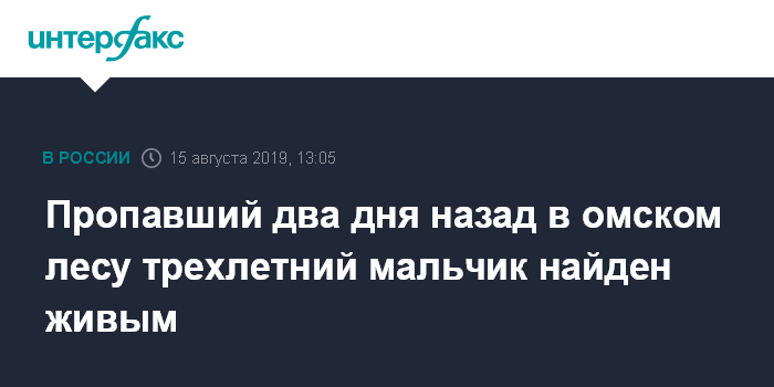 Москва. 15 августа. INTERFAX.RU - Трехлетнего мальчика, которого искали с 13 августа в Омской области, нашли живым.