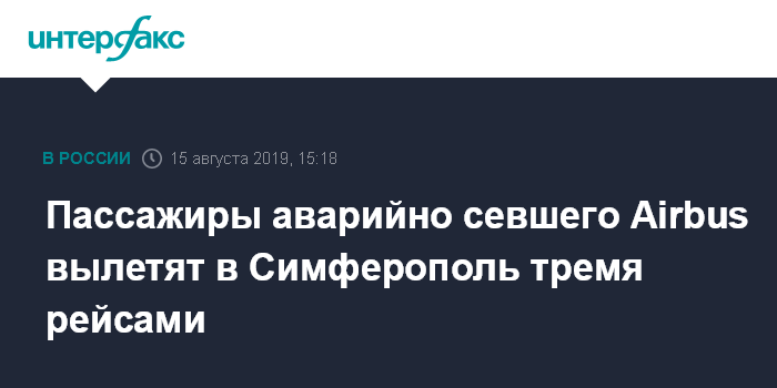 Москва. 15 августа. INTERFAX.RU - Пассажиры самолета "Уральских авиалиний", который аварийно сел на поле вскоре после вылета из аэропорта "Жуковский", будут отправлены в Симферополь тремя рейсами.