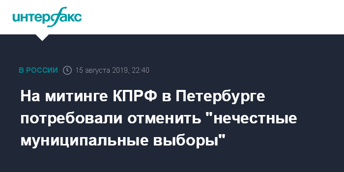 Москва. 15 августа. INTERFAX.RU - В Петербурге прошёл согласованный митинг городского отделения КПРФ против нарушений в ходе избирательной кампании и на предстоящих губернаторских и муниципальных выборах, передаёт корреспондент "Интерфакса" в четверг с места событий.