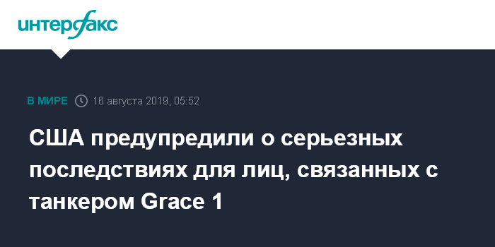 Москва. 16 августа. INTERFAX.RU - Серьезные последствия, в том числе отказ во въезде в США и получении американских виз, грозят членам экипажа танкера Grace 1 и лицам, имеющим к нему отношение, говорится в сообщении Госдепартамента Соединенных Штатов.