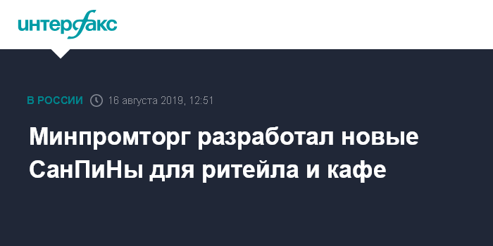 Москва. 16 августа. INTERFAX.RU - Минпромторг РФ подготовил проекты санитарно-эпидемиологических требований к торговым объектам, реализующим пищевые продукты, а также проект санитарно-эпидемиологических требований к организациям общественного питания.