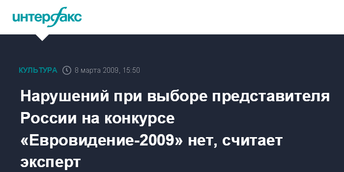 Москва. 8 марта. INTERFAX.RU - Западный эксперт по конкурсу "Евровидение" считает, что при организации конкурса по отбору российского представителя на "Евровидение-2009" нарушений допущено не было.