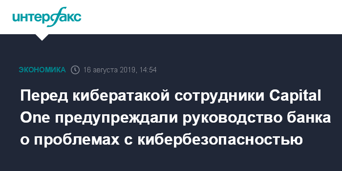 Москва. 16 августа. INTERFAX.RU - Сотрудники американского банка Capital One Financial Corp. перед крупной хакерской атакой в конце июля обращали внимание руководства компании на проблемы в подразделении, которое отвечает за кибербезопасность, узнало агентство Dow Jones от информированных источников.