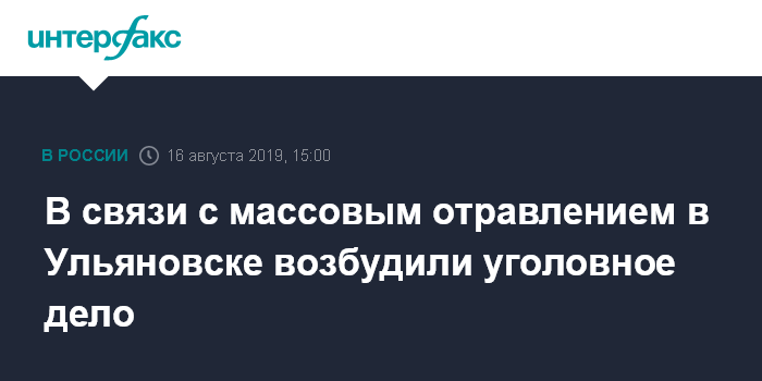 Москва. 16 августа. INTERFAX.RU - В связи с отравлением семи человек в Ульяновске возбуждено уголовное дело, сообщила пресс-служба Следственного комитета. Дело завели по статье о производстве товаров, не отвечающих требованиям безопасности здоровья потребителей, и повлекшем по неосторожности смерть двух или более лиц.