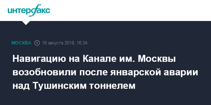 Москва. 16 августа. INTERFAX.RU - На участке Канала имени Москвы над Тушинским тоннелем, где 10 января произошла авария и велись восстановительные работы, в пятницу возобновилась навигация, сообщили "Интерфаксу" в пресс-службе канала.