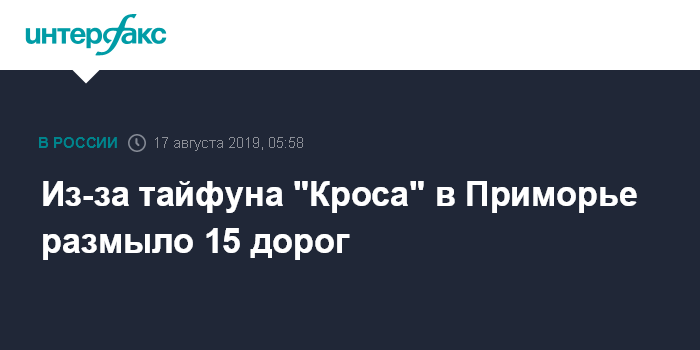 "Из-за тайфуна "Кроса" проезда нет на 15 участках дорог в Приморском крае. Там, где это возможно, работает техника. Восстановление проезда по остальным участкам будет начато после спада воды", - говорится в сообщении.