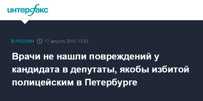 Москва. 17 августа. INTERFAX.RU - В результате медицинского обследования кандидата в муниципальные депутаты в Петербурге, которая заявила, что ее избил сотрудник полиции, повреждений не обнаружено, сообщают в субботу медики.