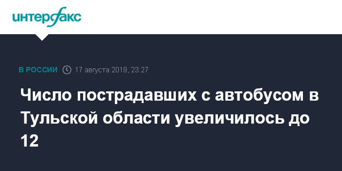 Москва. 17 августа. INTERFAX.RU - Количество пострадавших в результате дорожно-транспортного происшествия (ДТП) с участием междугороднего микроавтобуса в Тульской области увеличилось до 12 человек, сообщили "Интерфаксу" в Министерстве здравоохранении региона.