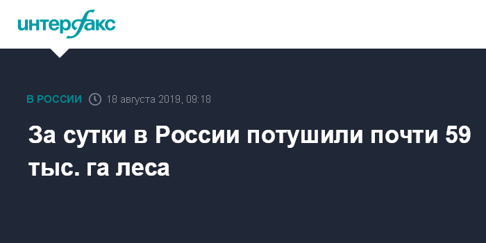 Москва. 18 августа. INTERFAX.RU - За прошедшие сутки на востоке России ликвидировали 53 лесных пожара на площади почти 59 тысяч гектаров, сообщили в пресс-службе Авиалесоохраны в воскресенье.