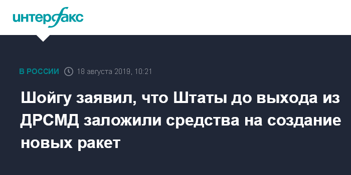 Москва. 18 августа. INTERFAX.RU - США заложили в бюджет средства на разработку ракет средней и меньшей дальности ещё до выхода из Договора о ликвидации таких ракет (ДРСМД), заявил министр обороны РФ Сергей Шойгу.