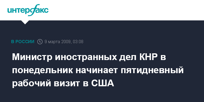 Пекин. 9 марта. ИНТЕРФАКС-КИТАЙ - Министр иностранных дел КНР Ян Цзечи в понедельник по приглашению госсекретаря США Хиллари Клинтон отбывает в США с рабочим визитом, который продлится до 13 марта.