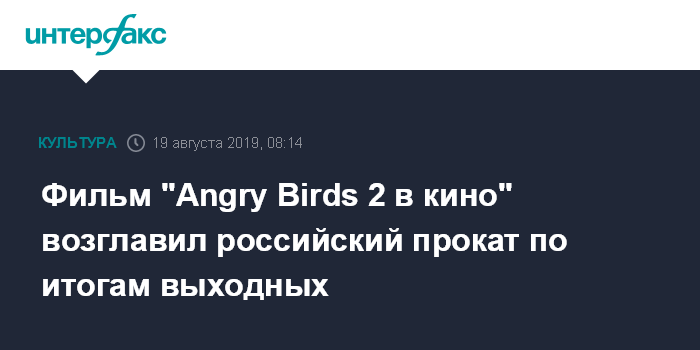 Москва. 19 августа. INTERFAX.RU - Мультфильм "Angry Birds 2 в кино" (The Angry Birds Movie 2) возглавил российский прокат, собрав за минувший уикенд 231,8 млн рублей, сообщил портал kinobusiness.com со ссылкой на предварительные данные. Российская премьера ленты состоялась 15 августа.