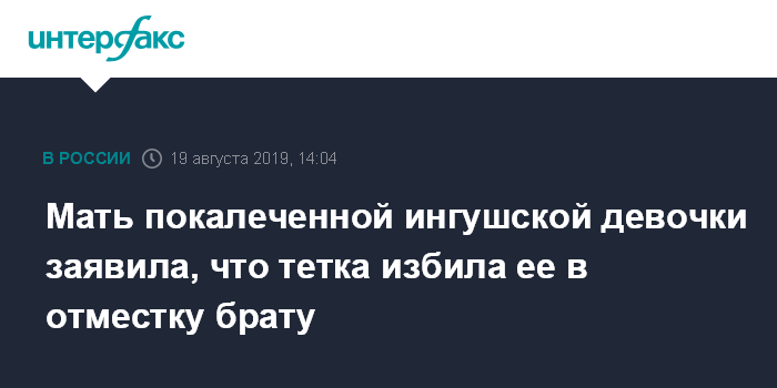 Москва. 19 августа. INTERFAX.RU - Родная мать ингушской девочки, которая лишилась часть руки после травм от пыток, связывает нанесение ей увечий родной теткой с местью.