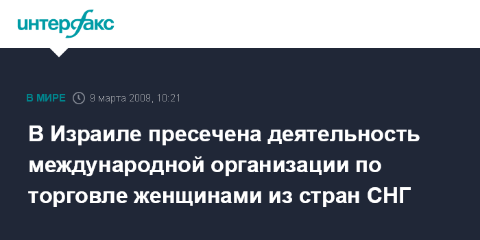 Москва. 9 марта. INTERFAX.RU - Положен конец преступной деятельности международной сети по торговле женщинами из стран СНГ, заявил в эфире радиостанции "Эхо Москвы" пресс-секретарь израильской полиции Алекс Кагальский.