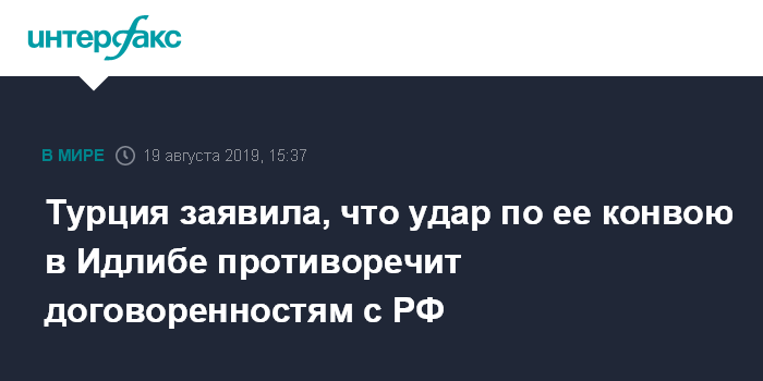 Москва. 19 августа. INTERFAX.RU - В Минобороны Турции осудили в понедельник авиаудар по своей автоколонне в сирийской провинции Идлиб и назвали его противоречащим договоренностям Анкары и Москвы по Сирии.