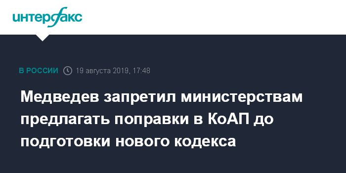 Москва. 19 августа. INTERFAX.RU - Премьер-министр РФ Дмитрий Медведев на время подготовки нового Кодекса об административных правонарушениях запретил министерствам инициировать изменения в действующий кодекс. Запрет касается федеральных органов исполнительной власти, рассказал "Интерфаксу" источник, знакомый с документом.