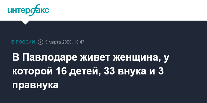 Москва. 9 марта. INTERFAX.RU - В Павлодарской области Казахстана в ходе завершившейся общенациональной переписи населения счетчики встретили 70-летнюю женщину, у которой 16 детей, 33 внука и внучки и 3 правнука.
