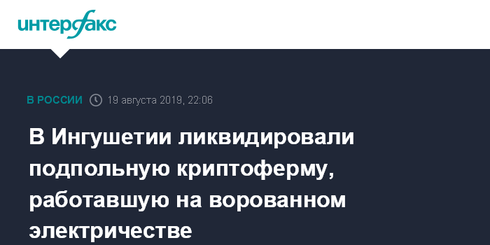 Москва. 19 августа. INTERFAX.RU - Сотрудники правоохранительных органов Ингушетии пресекли деятельность подпольного цеха по добыче криптовалюты. Об этом сообщили в понедельник агентству "Интерфакс" в пресс-службе республиканского МВД.