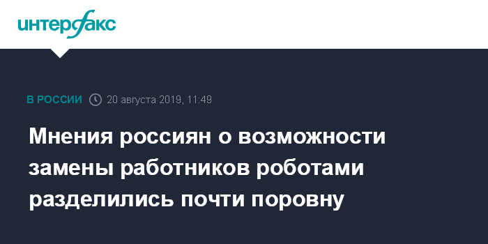 Москва. 20 августа. INTERFAX.RU - Перспектива замены людей роботами на рабочих местах не пугает три четверти работающих россиян (78%), вместе с тем 21% занятых опасаются такого развития событий, свидетельствуют данные опроса ВЦИОМ, поступившие во вторник в "Интерфакс".