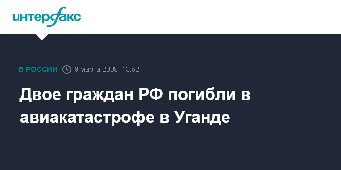 Москва. 9 марта. INTERFAX.RU - В авиакатастрофе самолета Ил-76, рухнувшего в озеро Виктория на территории Уганды, погибли два гражданина России и двое граждан Украины, сообщил "Интерфаксу" советник посольства РФ в Уганде Руслан Мадиев.