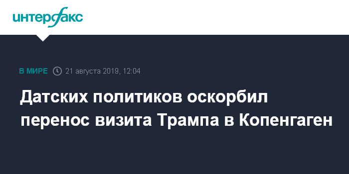 Москва. 21 августа. INTERFAX.RU - Датские политики посчитали оскорблением то, что президент США Дональд Трамп перенес запланированный визит после заявления премьер-министра Дании о незаинтересованности датской стороны в продаже Гренландии Соединенным Штатам. Об этом сообщает агентство EFE.