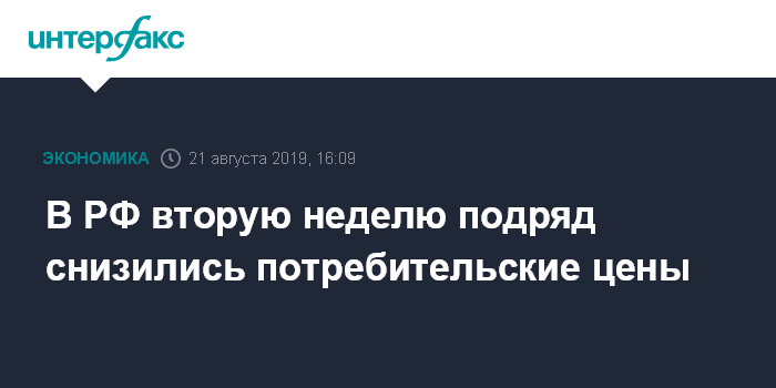 Москва. 21 августа. INTERFAX.RU - Снижение потребительских цен в РФ с 13 по 19 августа составило 0,1% вторую неделю подряд, сообщил в среду Росстат.