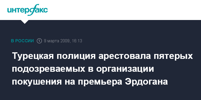 Москва. 9 марта. INTERFAX.RU - Полиция турецкого города Адана арестовала пять человек по подозрению в подготовке покушения на премьер-министра страны Реджепа Тайипа Эрдогана, сообщает в понедельник британская телерадиокорпорация Би-би-си со ссылкой на местные СМИ.