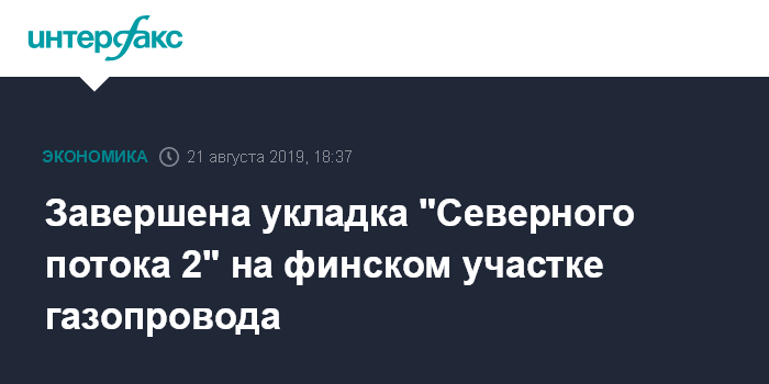Москва. 21 августа. INTERFAX.RU - Оператор строительства газопровода "Северный поток 2" из России в Германию - Nord Stream II - в среду, 21 августа, закончил укладку газопровода на финском участке.