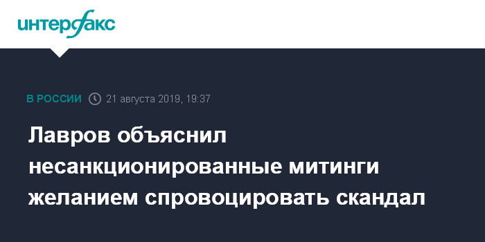Москва. 21 августа. INTERFAX.RU - Несогласованные митинги устраивают люди, которые хотят специально спровоцировать скандал и отказываются от мест проведения акций, которые им предлагают власти, заявил глава МИД Сергей Лавров. Так он ответил на вопрос о протестах в Москве на пресс-конференции после переговоров с коллегой из Германии Хайко Маасом.