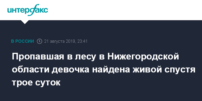 Москва. 21 августа. INTERFAX.RU - Пропавшую в лесу в Нижегородской области пятилетнюю девочку из деревни Степановка обнаружили живой спустя трое суток поисков, сообщает следственное управление СК РФ по региону.