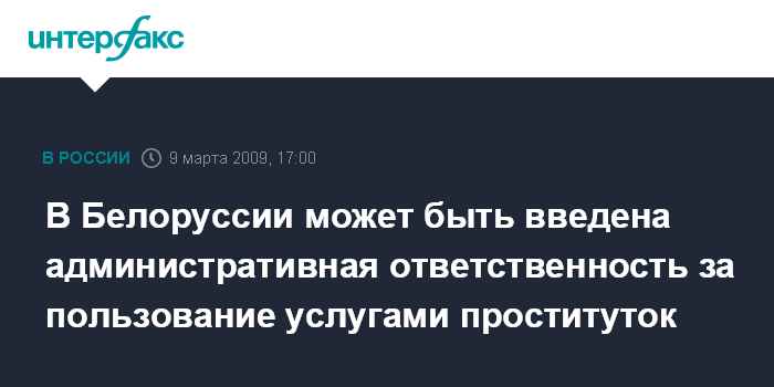 Москва. 9 марта. INTERFAX.RU - Генеральная прокуратура Белоруссии предлагает ввести административную ответственность за пользование услугами проституток и заблокировать доступ к сайтам, рекламирующим интим-услуги.