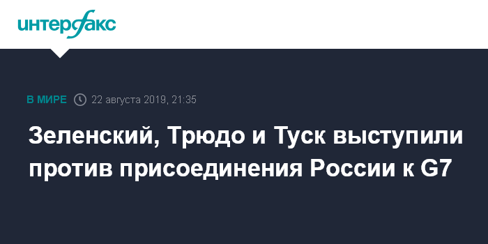 Москва. 22 августа. INTERFAX.RU - Президент Украины Владимир Зеленский провел телефонные разговоры с председателем Европейского совета Дональдом Туском и премьер-министром Канады Джастином Трюдо, в ходе которых они заявили о неприемлемости нового присоединения России к "Большой семерке".