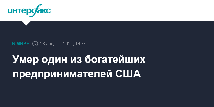 Москва. 23 августа. INTERFAX.RU - В США умер один из самых богатых людей страны, бывший вице-президент Koch Industries, спонсор Республиканской партии Дэвид Кох. Об этом говорится в заявлении его семьи, пишет Forbes.