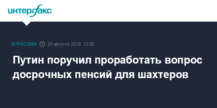 Москва. 24 августа. INTERFAX.RU - Президент РФ Владимир Путин поручил правительству до 31 декабря проработать вопрос досрочного пенсионного обеспечения работников угольной промышленности.