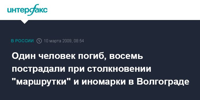 Москва. 10 марта. INTERFAX.RU - В Центральном районе Волгограда автомобиль марки "Сааб" столкнулся с пассажирской "Газелью", один человек погиб, восемь попали в больницу.