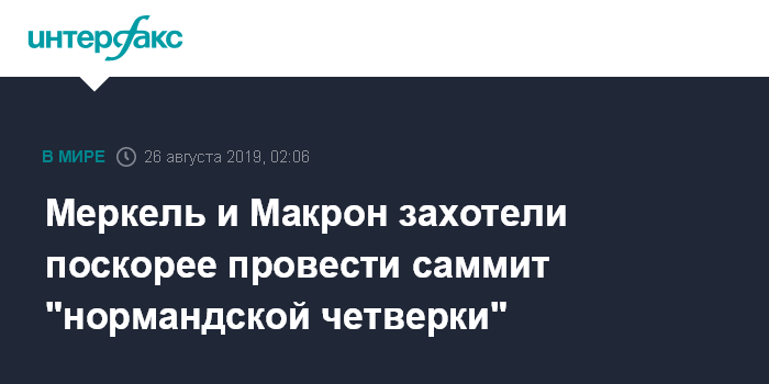 Москва. 26 августа. INTERFAX.RU - Канцлер ФРГ Ангела Меркель на полях саммита "Большой семерки" во французском Биаррице сообщила о желании Парижа и Берлина как можно скорее провести саммит лидеров государств "нормандской четверки" - Германии, Франции, Украины и России, сообщило издание Deutsche welle.