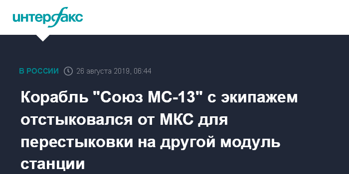 Москва. 26 августа. INTERFAX.RU - Транспортный пилотируемый корабль "Союз МС-13", на борту которого находится его экипаж, начал отходить от Международной космической станции (МКС) для перестыковки, передаёт корреспондент "Интерфакса" из Центра управления полётами.